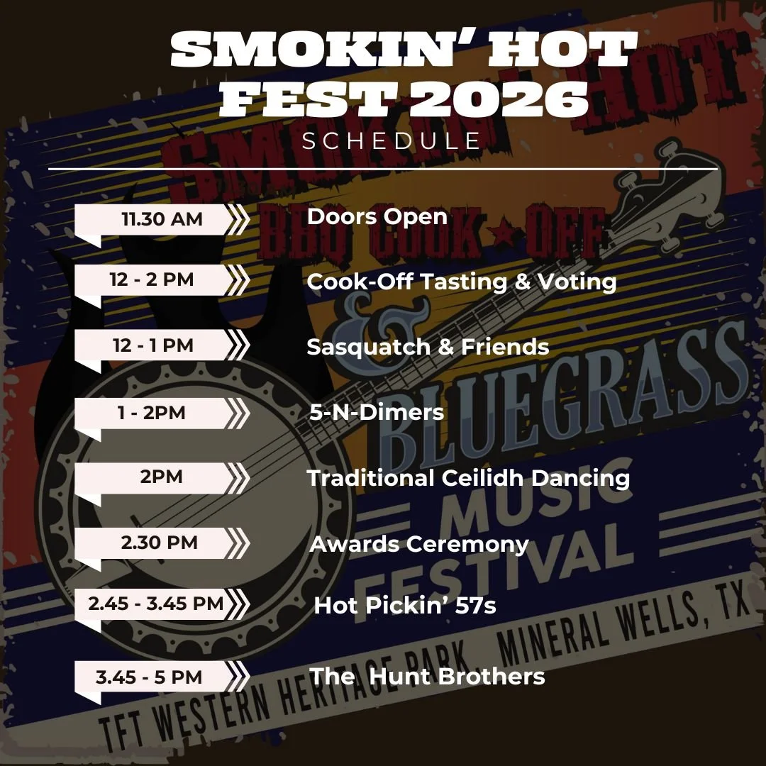 Join us for the 5th annual Smokin’ Hot BBQ & Bluegrass Festival. Help us crown the 2026 Mineral Wells BBQ Champion and enjoy some of the best Brisket in Texas. We’ve got over $700 in cash prizes and trophies for the winners and your All Access Pass gets you a taste of every entry and an afternoon of Bluegrass.